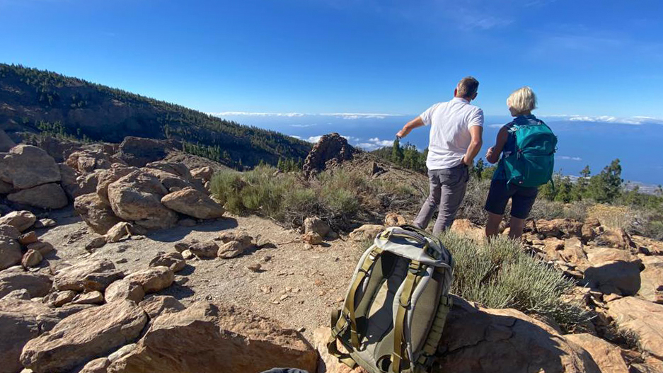In the following section, the route becomes a little more scrambly. On the narrow path, you climb partly over rocks and otherwise via small zigzag paths. In between, the trail runs along the back of the slope. Gradually, you gain height. You pass a small cave decorated with flowers and other items. Once you round the slope, the ascent becomes steep. If the weather is good and no clouds obstruct the view, you can already enjoy magnificent views from the first summits (Roques de Cedro), which you reach one after another. Opposite you lie Teide and Pico Viejo. Below you, at the foot of the mountain, you can see the track leading to Boca Tauce. On the other side, in good weather, you can see far across the south-west coast of the island and to the neighbouring islands of La Gomera, El Hierro and La Palma.