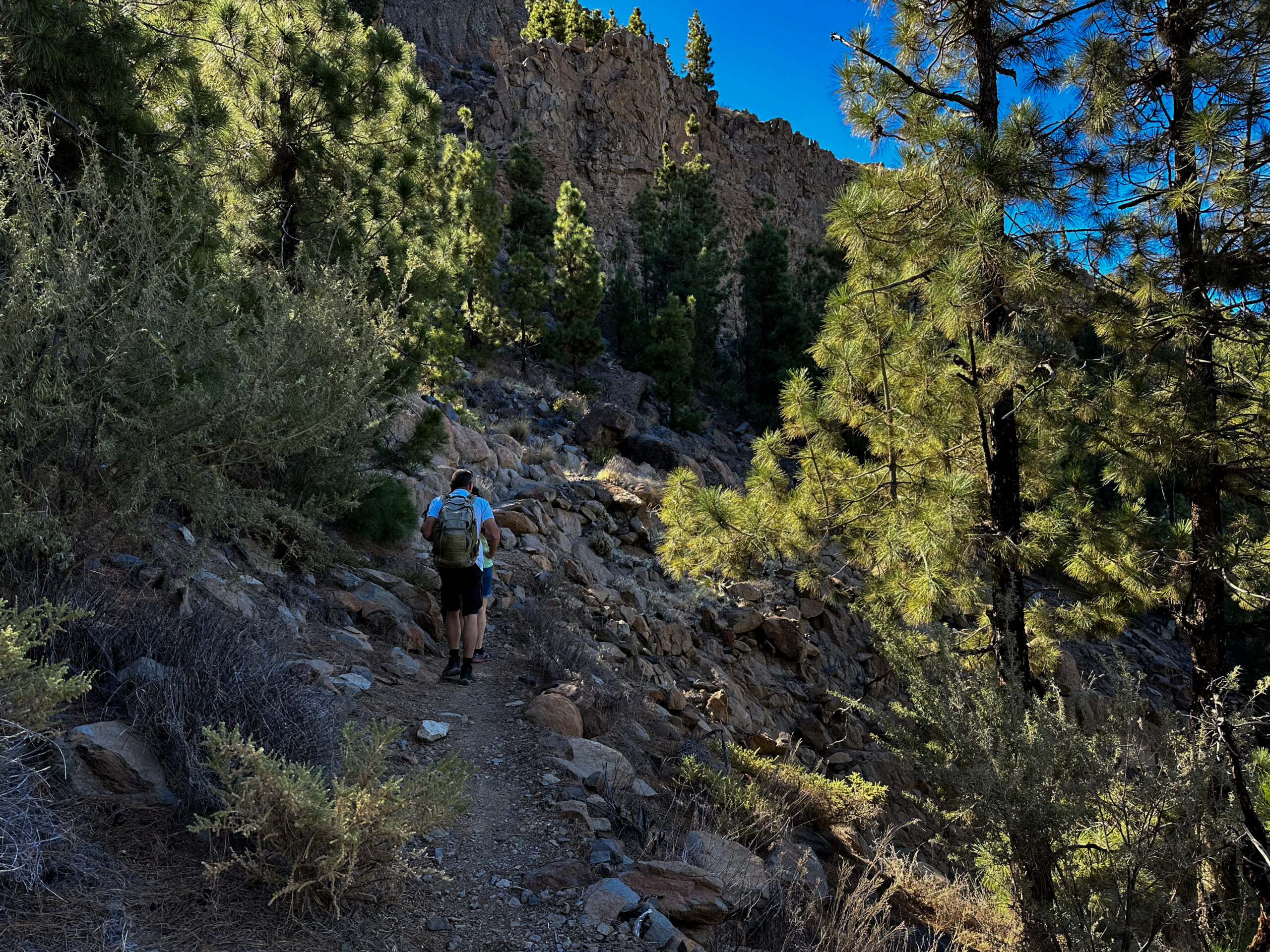 From there, you continue for quite some time, gently descending on a good hiking path along the back of the slopes of the Cañadas through pine forest. From time to time, the forest opens up and offers beautiful views. To your right lie Barranco Mañoca and Barranco de las Peguerías. The path passes both ravines along the ridge. After a while, you will see a fire tower ahead of you. Here you can climb onto the rocks to enjoy the view or take a short rest.